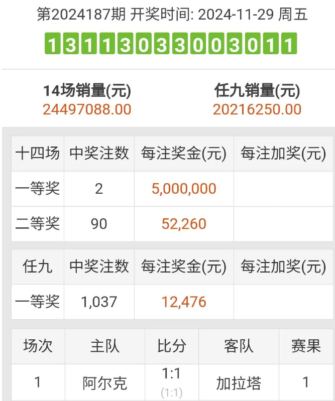 2024-11-29日 24187期胜负14场和任九开奖