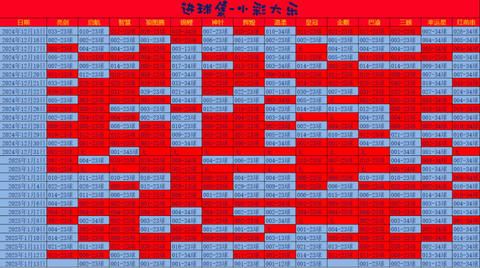 2025-01-13日 启航进球、亮剑进球、智慧进球、狼图腾进球、神针进球、温柔进球、辉煌进球、皇冠进球、锦鲤进球、进球-小彩大乐